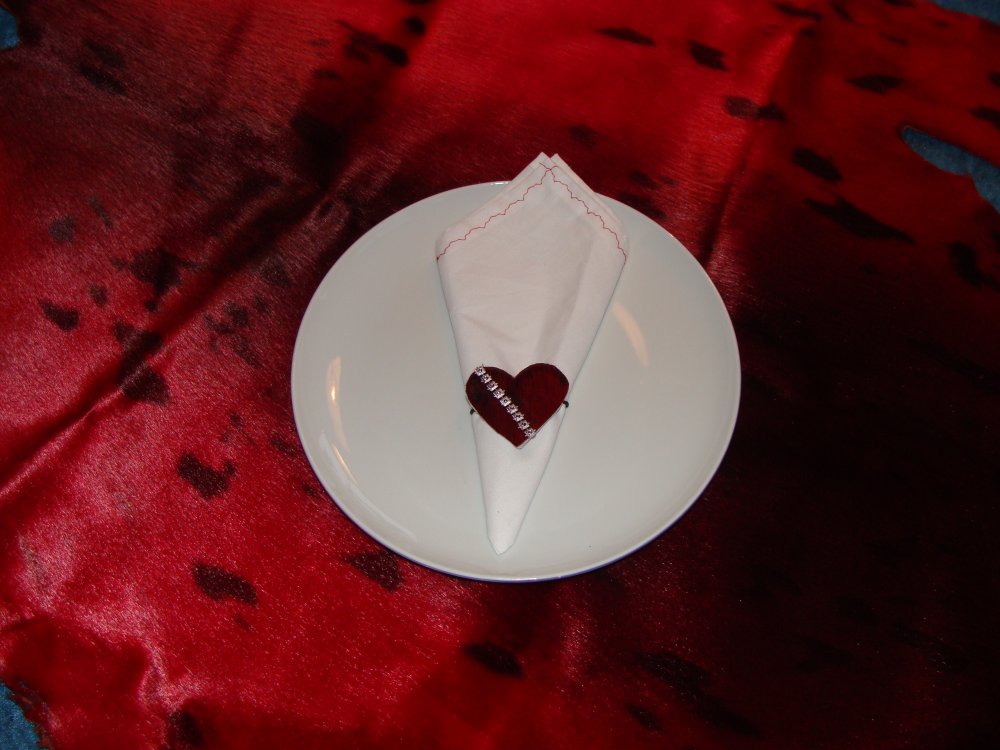 Hjerte servietring af rød farvet sælskind med glimmer.